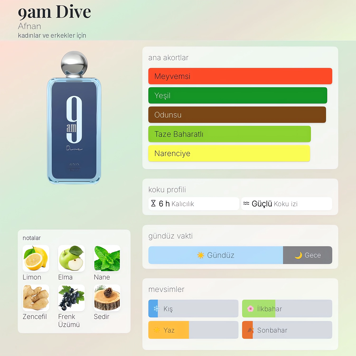Baz notalar sayesinde 9 AM Dive ferah karakterini kaybetmeden daha sıcak ve dengeli bir kapanış yapar. Gün boyu temiz ve enerjik bir his bırakır.