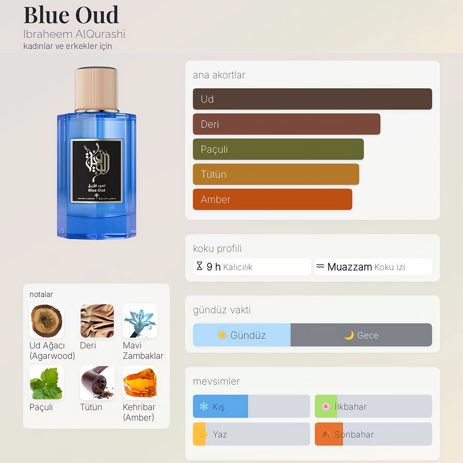 Blue Oud, odunsu, oriental ve hafif aromatik koku ailesine ait zengin ve katmanlı bir kompozisyona sahiptir. Tende aşama aşama gelişerek her evrede farklı bir derinlik ve sofistike etki sunar.