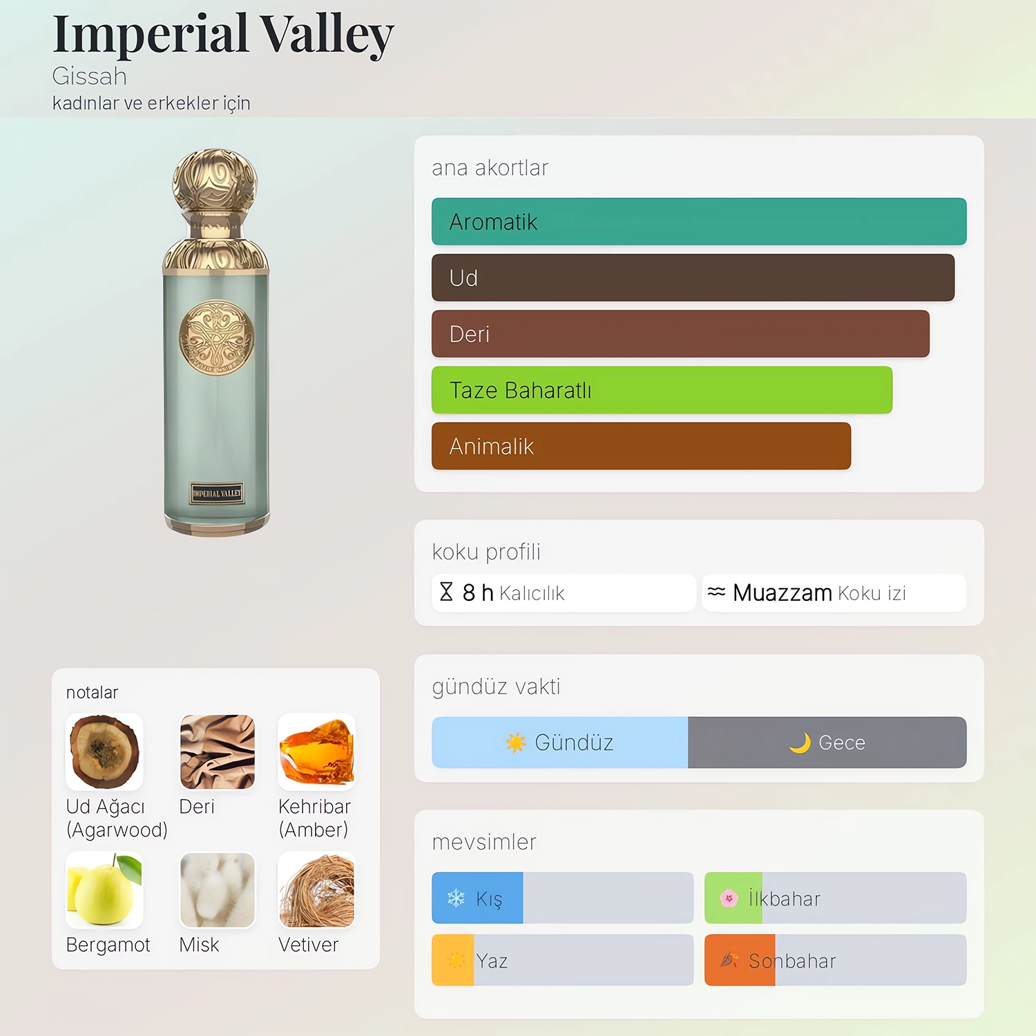Imperial Valley, yüksek performans ve kalıcılık arayanlar için idealdir; gün boyu etkileyici bir iz bırakır ve özellikle soğuk havalarda veya akşam kullanımlarda öne çıkar. Bu parfüm, zengin aromatik karakteri ve güçlü yapısıyla dikkat çekici bir imza kokusudur.