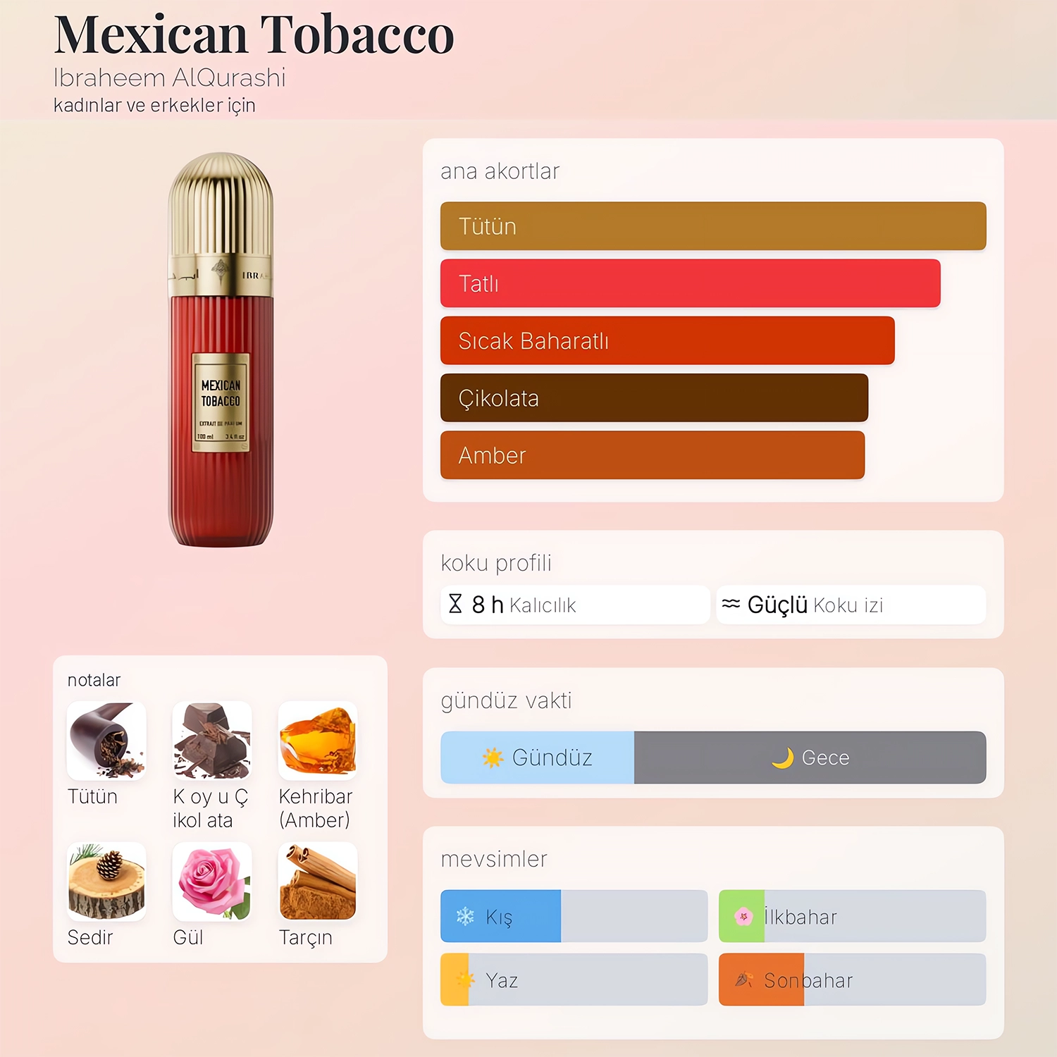 Baz notalar sayesinde Mexican Tobacco tende uzun süre kalıcılığını korur ve sıcak, baştan çıkarıcı bir imza bırakır.