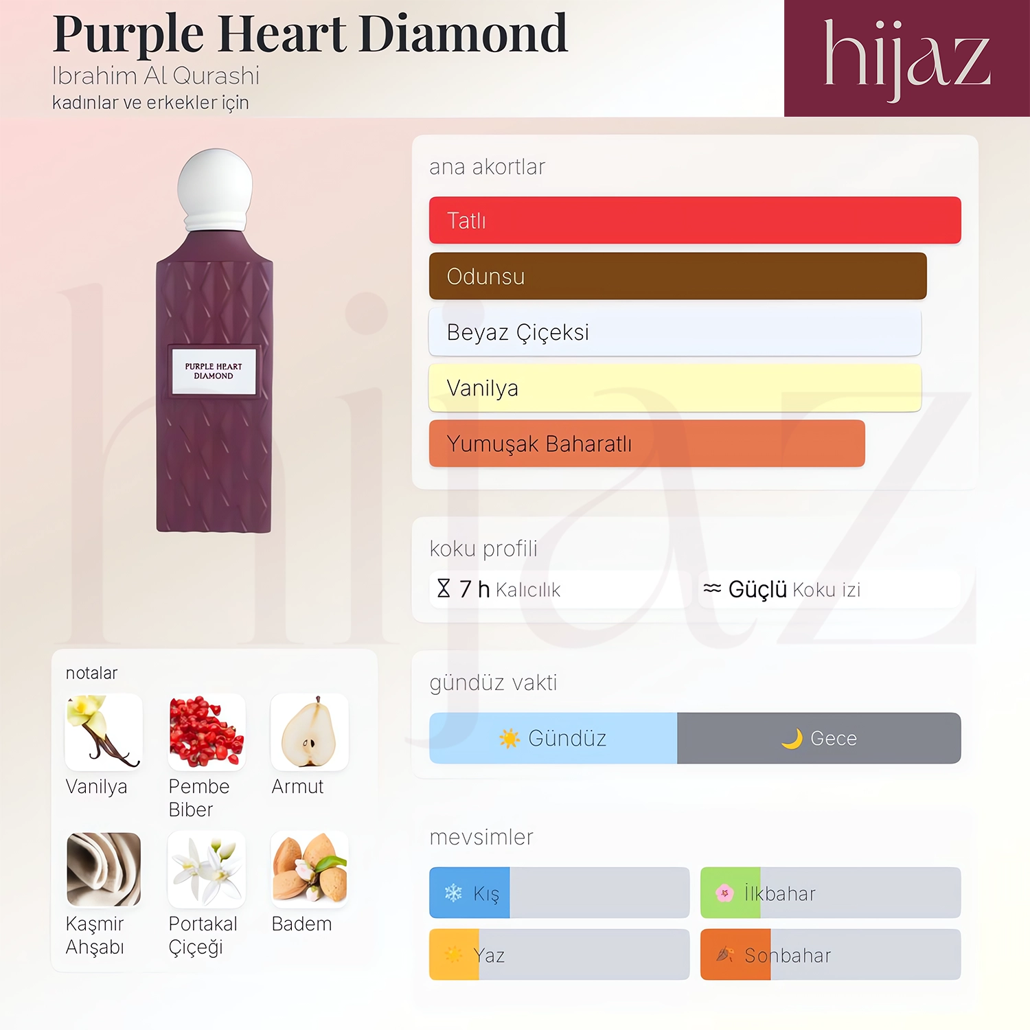 Purple Heart Diamond, çiçeksi, odunsu ve miskli koku ailesine ait modern ve sofistike bir kompozisyona sahiptir. Parfüm tende katmanlı şekilde gelişir ve her aşamada farklı bir karakter ortaya çıkarır. Dengeli yapısı sayesinde hem günlük kullanım hem de özel anlar için uygun bir tercihtir.